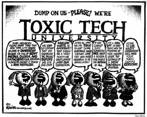 The choice of Texas Tech is perhaps not surprising. The university has been rented by private interests in the past, so at least there is some precedent there. West Texans remember that Tech was the sub-contractor that received a $1.5 million grant to help MERCO Joint Ventures get the Sierra Blanca sludge operation permitted (with the help of former legislator and former state water board commissioner Cliff Johnson) in a record twenty-three days. "These are the folks that brought Texas the largest sewer dump in the world," said Marfa resident Gary Oliver. And Texas Tech's new Chancellor, John Montford, was one of the senators who helped Bigham get his first legislative effort through the Senate in 1995.