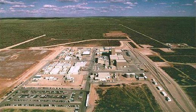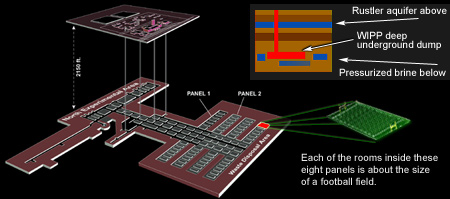 WIPP, under the Rustler aquifer. Eight "panels" are made up of six giant storage rooms. Each room in a panel is about the size of a football field. |