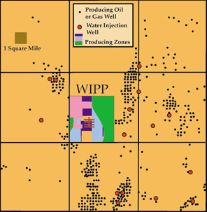 Drilling Hazards at WIPP Dozens of oil and gas wells are within 2 miles of the WIPP site boundary. If drilling for proven reserves of oil and gas hits the waste rooms, massive amounts of radioactivity will come to the surface. For example, drilling with air compressors can release enough radioactivity to violate health and safety standards within 10 seconds. Future drilling could additionally bring radioactive brine to the surface and into the upper aquifer, which would flow into the Pecos River and the accessible environment. Companies also inject fluid to increase oil production. Fluids have moved for miles through the interbeds, and scientific studies show that large amounts of waste could be transported offsite, even if the injection occurs outside of the site boundary. |